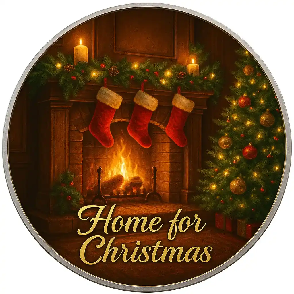 Rewers w całości pokryty jest kolorową ilustracją świąteczną. W centralnym miejscu widnieje kominek ozdobiony trzema czerwonymi skarpetami, a obok niego bogato udekorowana choinka pełna światełek i bombek. Ciepłe światło płomieni podkreśla rodzinny charakter sceny, a napis „Home for Christmas” dopełnia nostalgicznego klimatu. To moneta, która przywołuje skojarzenia z powrotem do domu na święta i magią grudniowych wieczorów.