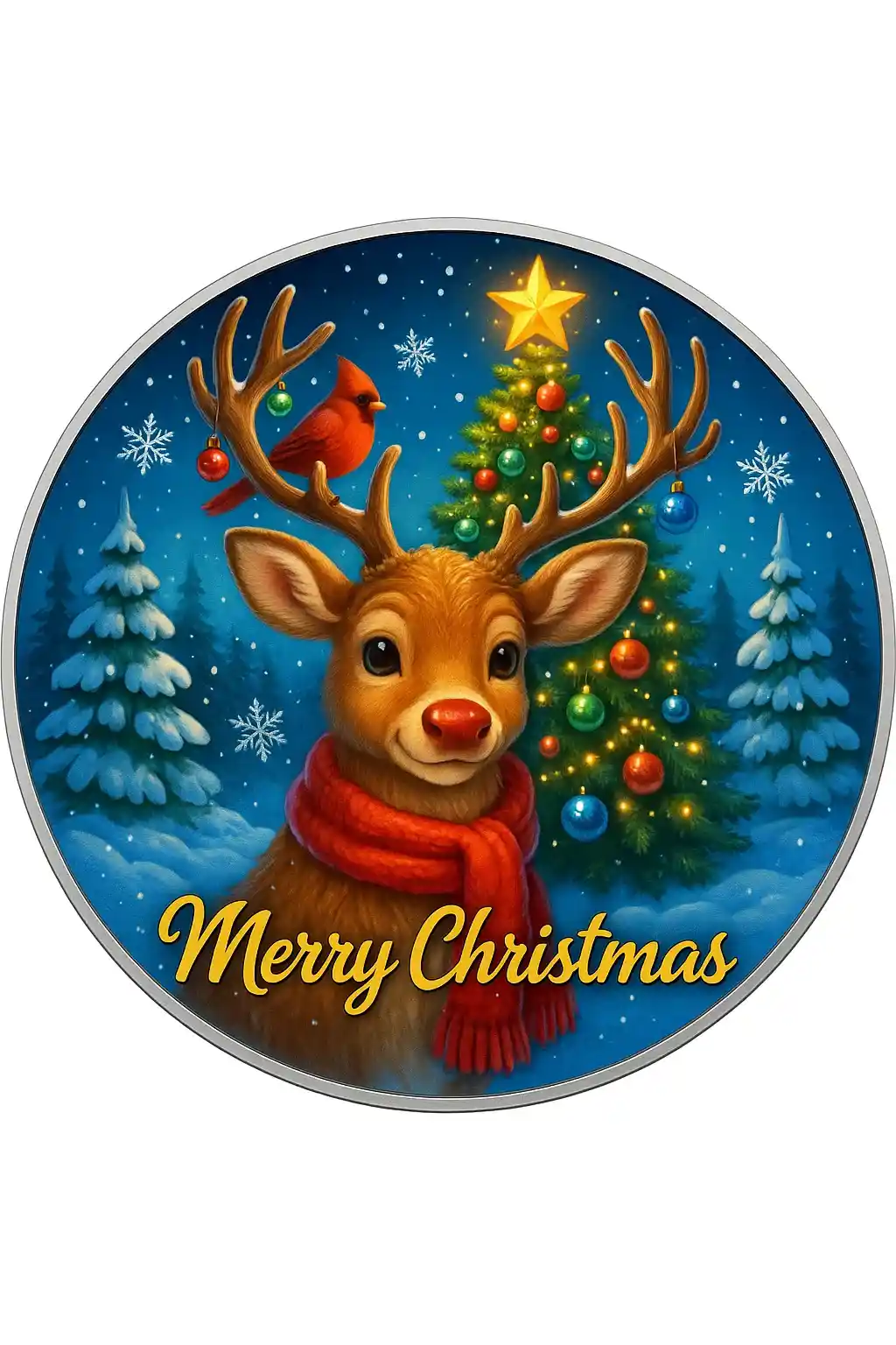 Srebrna moneta Amerykański Orzeł 1 uncja srebra 2025 Merry Christmas: Reindeer to wyjątkowe, sezonowe wydanie jednej z najbardziej rozpoznawalnych monet świata, wzbogacone o kolorowy, świąteczny motyw. Rewers przedstawiający uroczego renifera na tle udekorowanej choinki i zimowego krajobrazu wprowadza ciepłą, bajkową atmosferę świąt. To idealny wybór dla osób szukających eleganckiego, tematycznego prezentu lub chcących dodać do swojej kolekcji odrobinę bożonarodzeniowej magii.